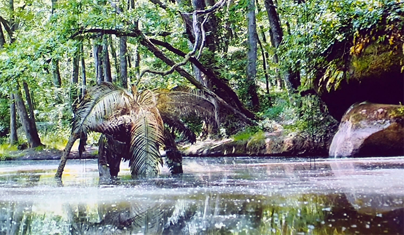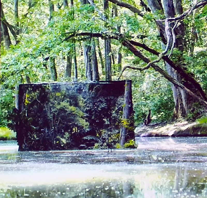 The Absolute Hut (of action potential) Wood, moss, paper, copper, video projection, video monitors ; 200 x 300 x 375 cm