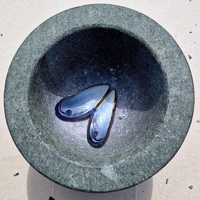 The other two sculptures in the series. A hand beaten copper bowl with a ‘silver fish’ floating in water based on the oval shaped compass needle illustrated in Breve Compendio de la Sphera de la arte Navegar by Martin Cortes 155. Wafer thin fish shaped iron leaves were also used by 11th century Chinese geomancers. Nails and iron filings reveal an embedded magnetic field and hark back to a legend on the discovery of the lodestone, a naturally magnetic mineral, which recalls a Greek shepherd who noticed the nails in his boots were attracted to the rock beneath his feet.