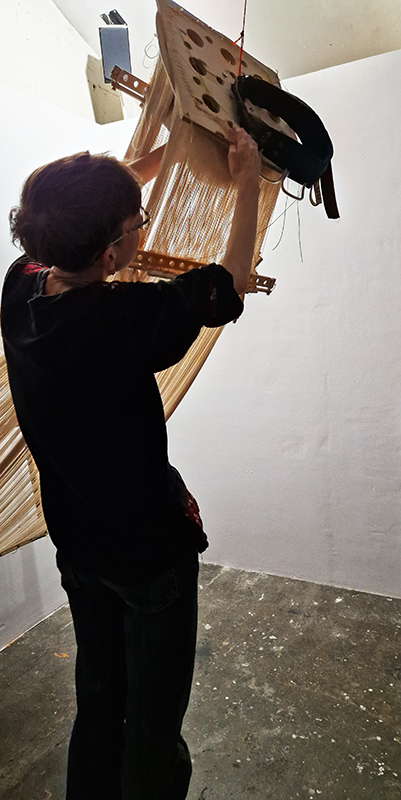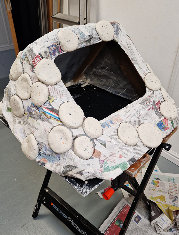 This sculpture also embodies the passage of time, and a layering of information, in the months of collecting paper donations or scavenging the recycling bins, weeks tearing down the hundreds of prints and drawings into squares decreasing by 1mm every 50 sheets, drilling holes through the centre and hours to build the almost 3m stack. I’m very grateful to everyone who donated some of their work archive. These images are now secreted within the layers of the sculpture, hinted at where edges are exposed, echoing the Earth’s sedimentary knowledge.