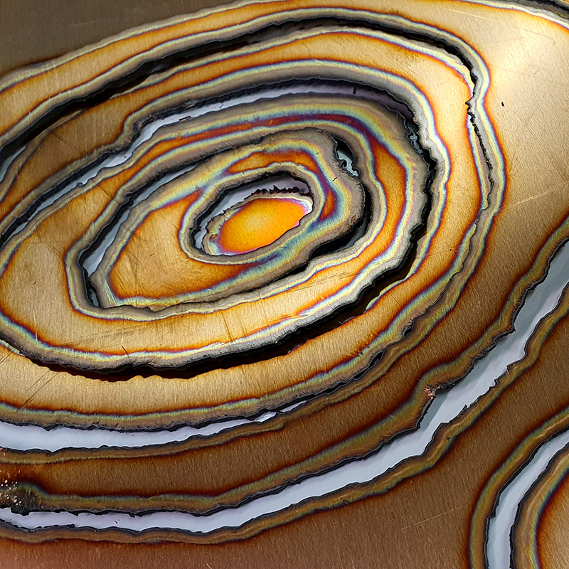 I first came across directional magnetic steel in the Electronic & Magnetic Materials Group open day at the National Physical Laboratory. Intrigued, I wanted to know if I could get hold of some to work with. I was put in touch with Union Steel Products who were very helpful in supplying a small amount (to them) of the material, but they import the product, and it arrives with an indeterminate protective matt grey coating. This was my challenge. It took many days of sanding and gently etching each sheet to reveal the pattern. It was a very temperamental material to work with, the pattern might appear but quickly tarnish and muddy over. So much of the work in the resulting sculpture was about the process of exposing an internal mechanism.
