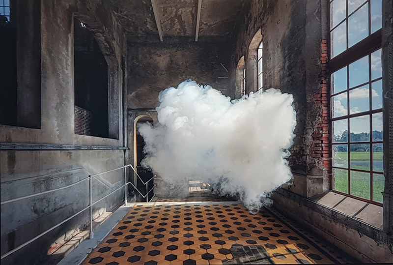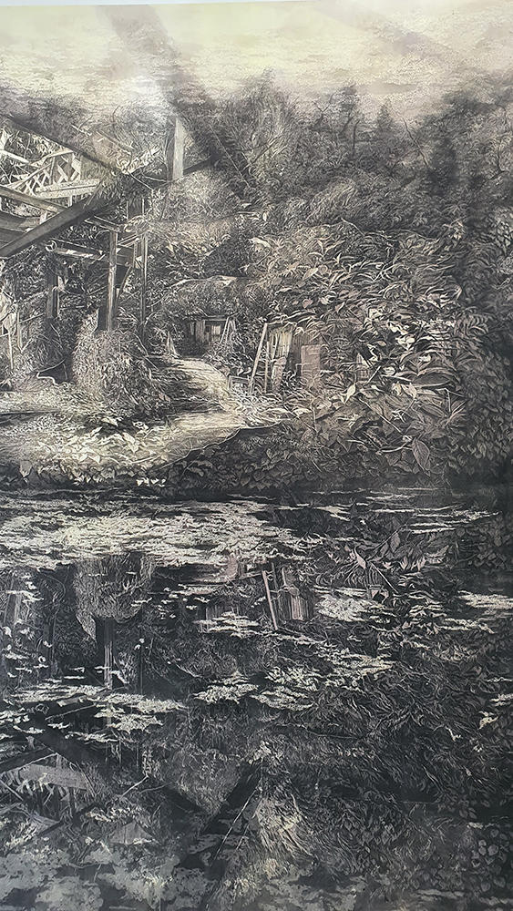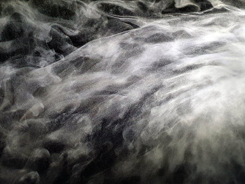 A World of Water takes the North Sea and the historical relationship between Norfolk and the Netherlands as its starting point to look at the human impact on the sea. It was wonderful to see the original book Mundus Subterraneous from 1664 by Athanasius Kirschner whose geological illustrations and speculations I have been fascinated by. Olafur Eliasson’s suspended Shore Compass uses driftwood to reflect on navigation of an uncertain world. Some great maps in this exhibition including the intriguing map of sandbanks off the coast around Great Yarmouth. I have enjoyed following Julian Charriere’s visually dramatic work on Instagram so it was good to see these images scaled up. Andrew Watkinson’s montage based on research from the Tyndall Centre for Climate Change about coastal erosion in Norfolk swerves from resignation to resistance, hope to despair and took me back to my BA dissertation (The Communication Of Ecological Concerns Through Contemporary Artistic Practice, 2007) writing about climate change warnings coming from the Tyndall Centre and the frustration of researchers about distorted media coverage that made it hard for the public to understand the facts. Suffolk too has lost a lot of land to the sea since I was a child there. Although dreams of tidal waves are common anxiety dreams I believe mine were also influenced by overheard stories of the North Sea flood of 1953 when a storm surge coincided with a high spring tide, which my parents and local villagers remembered vividly, it was the worst flood of the 20th century in England and Scotland and many lives were lost. Maggi Hambling’s sublime Wall of Water holds frozen the terrifying waves that may threaten us while Cian Dayrit’s Dam Nation examines the impact to communities and ecosystems when water is held back or re-routed.