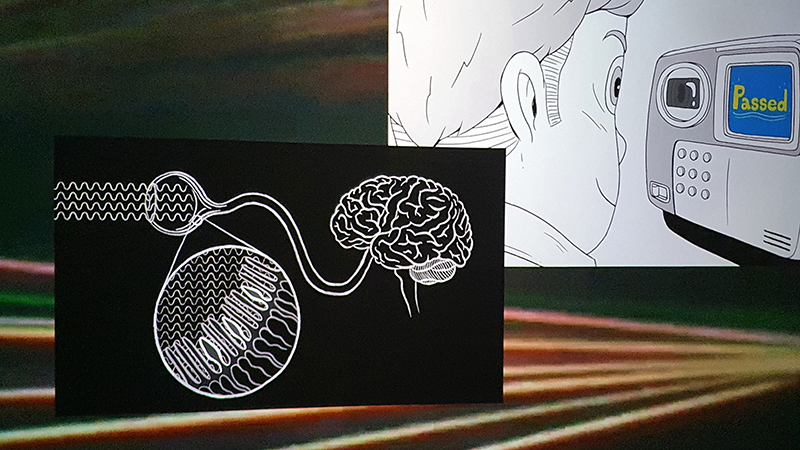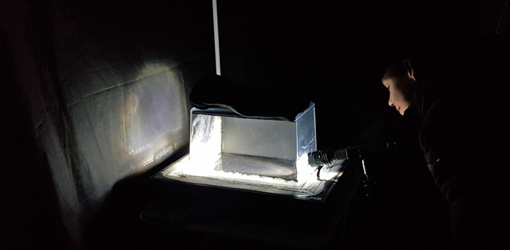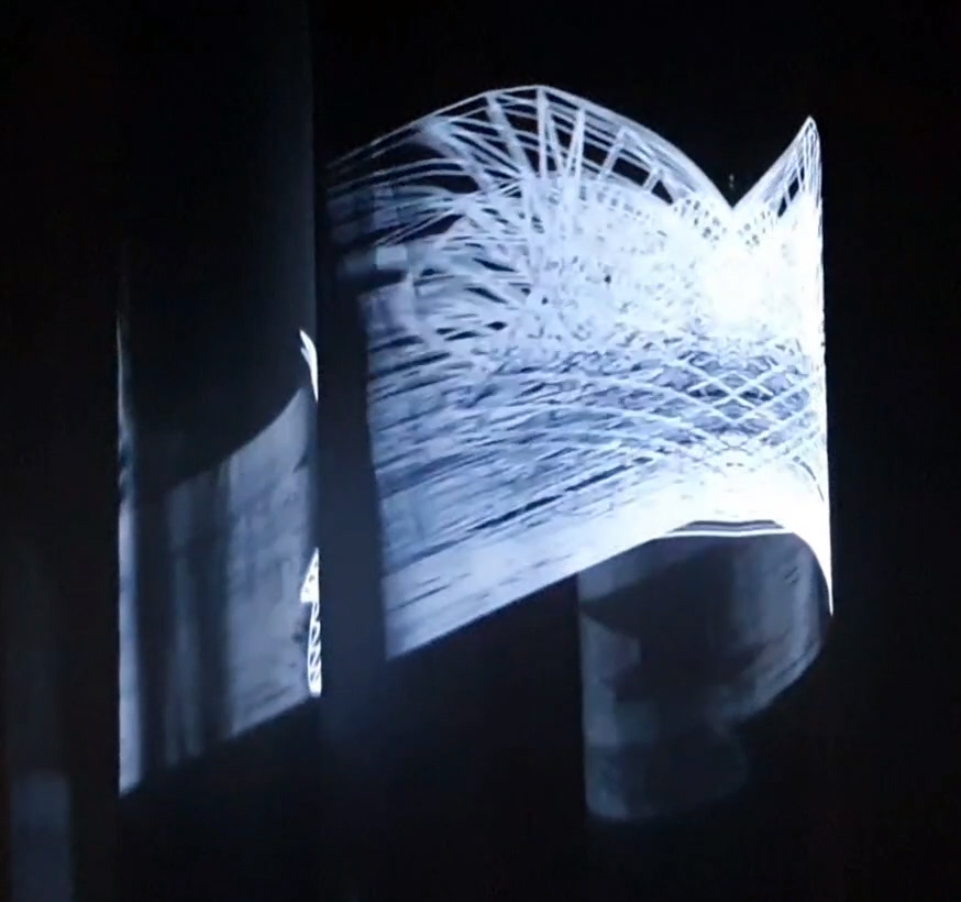 Lithos Panoptes, optical lenses, wood, steel, two-way projection; Sculpture H172 x W170 x D50 cm, Rear projection screen H180 x W180 cm.