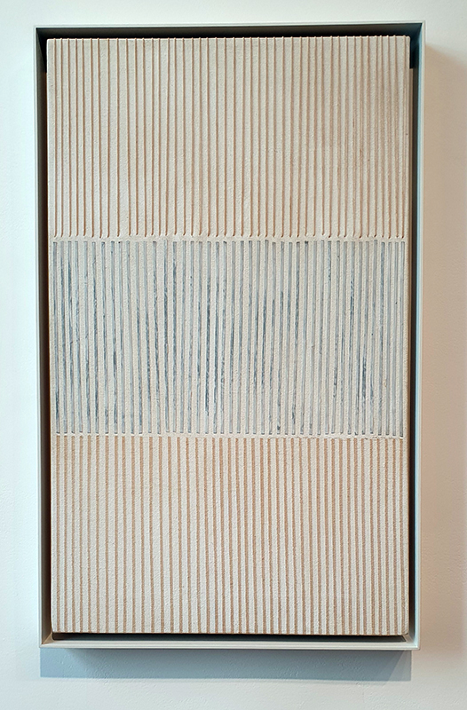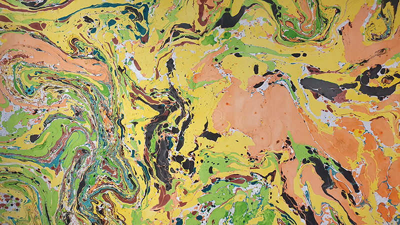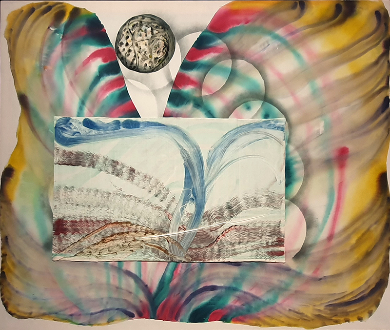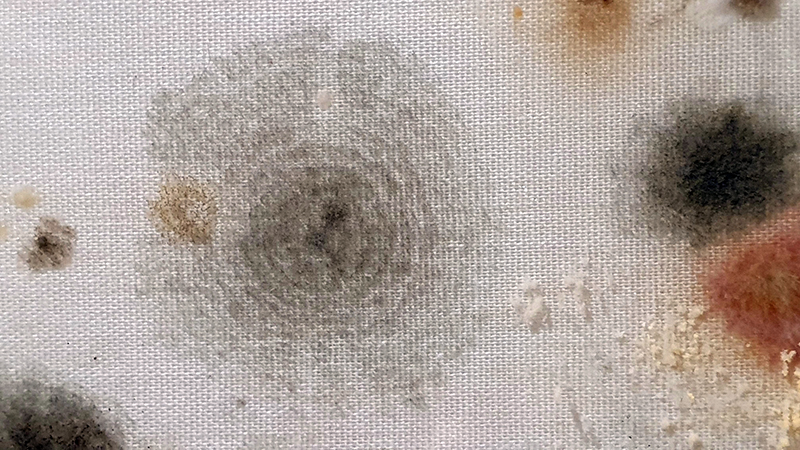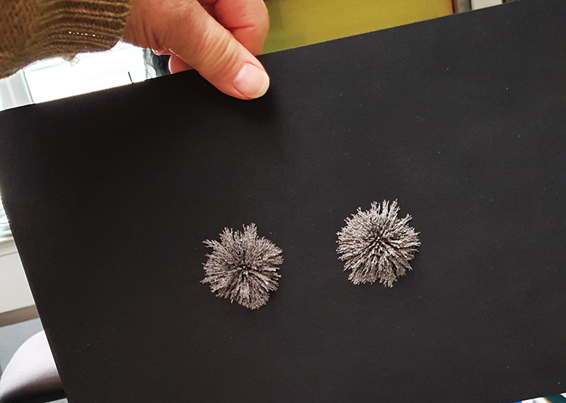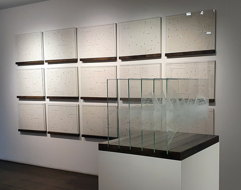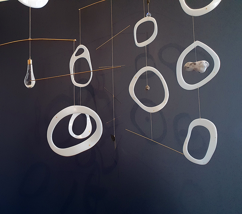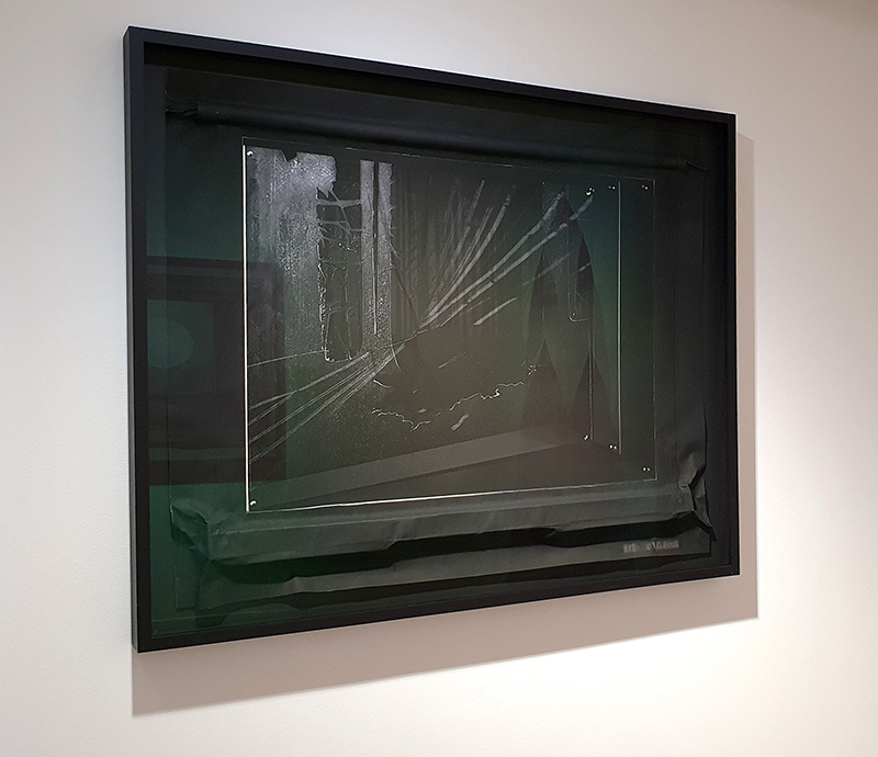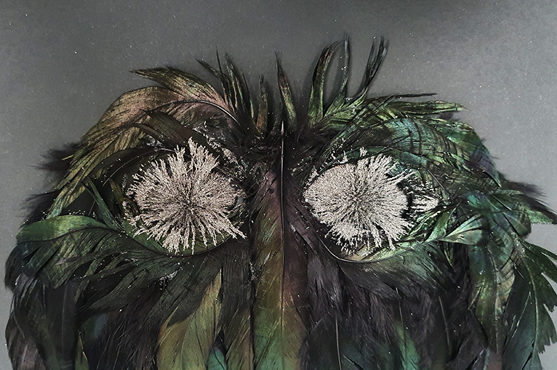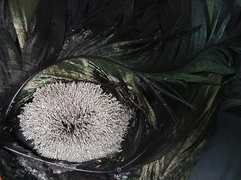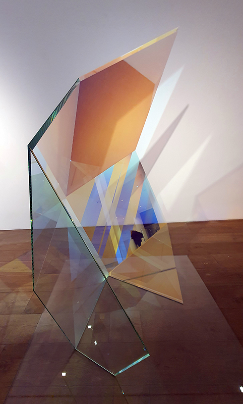 Materials celebrated through this exhibition included neural pathways stimulation of the visual system by pressure on the eyelids to see phosphenes, glittery thick folds of acrylic on canvas, leaded glass breakages, ephemeral copper wire net, faux marble that is actually hair on the barbers concrete floor.