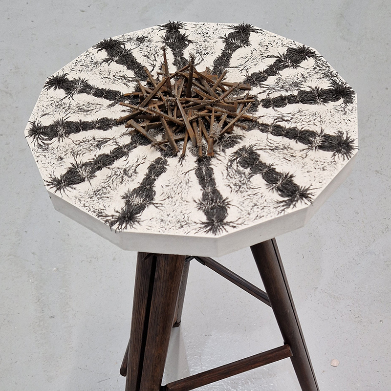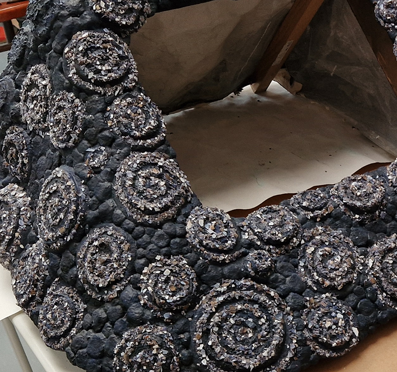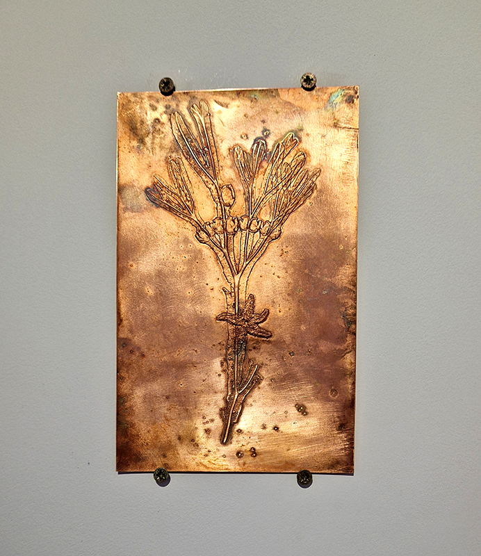 I have started work on inserting copper segments into the new sculpture for the Instruments of the Anemoi series. The other larger pieces of etched and patinated copper were added at the time of casting, held in place with tape and hope when the concrete was poured into the mould. This series of sculptures are suggestive of the pedestals that support various instruments used in monitoring the Earths’ magnetic field but are envisaged here as speculative objects used by the wind gods as the first emissaries of navigation.