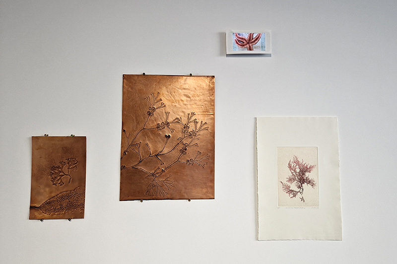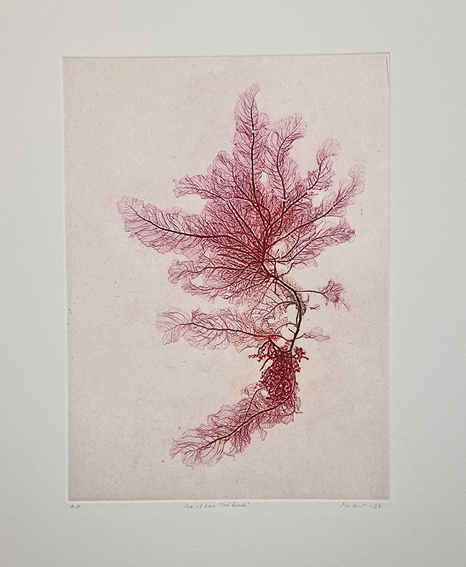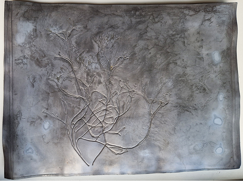 Liz Elton’s sensitive work Black and Blue (compostable bio materials, cabbage and fruit dye saddened with iron, silk, poppy and sage seeds) showing in A Changed Environment at Messums London. This group show examines changing ideas of beauty, ecology, and sustainability, as well as themes of place, memory, and identity, revealing how connections to the natural world can inspire both understanding and hope. I love the delicacy of this new work and the term ‘saddened by iron’ which is used in the dying process to dull a colour, and which, as Liz says, also emotes the hardships of industrial life.